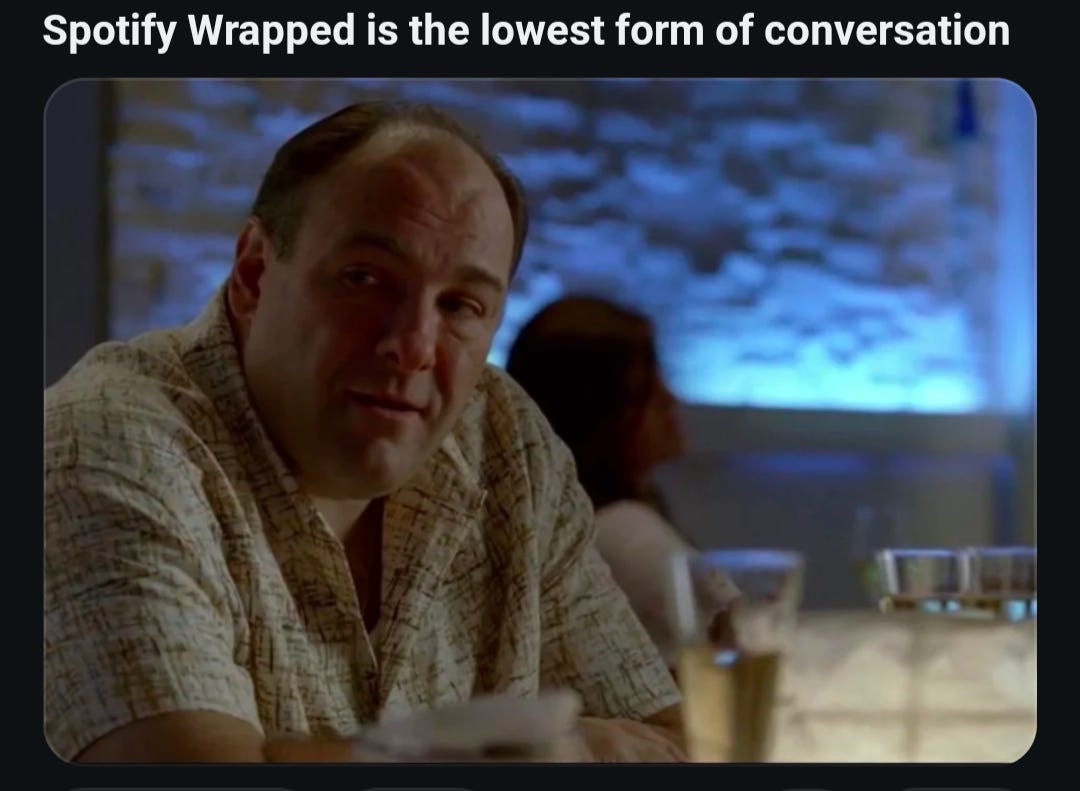 Sí, otro año más de lucha por economizar nuestra atención, con Spotify a la carga en su propia campaña de blanqueo con el Wrapped. Claro que es complicado lograrlo Kanye West se te cuela en el top de lo más escuchado, o cuando la gente sigue teniendo presente que tienen muchos anuncios de reclutamiento para eliminar inmigrantes y derechos humanos.
