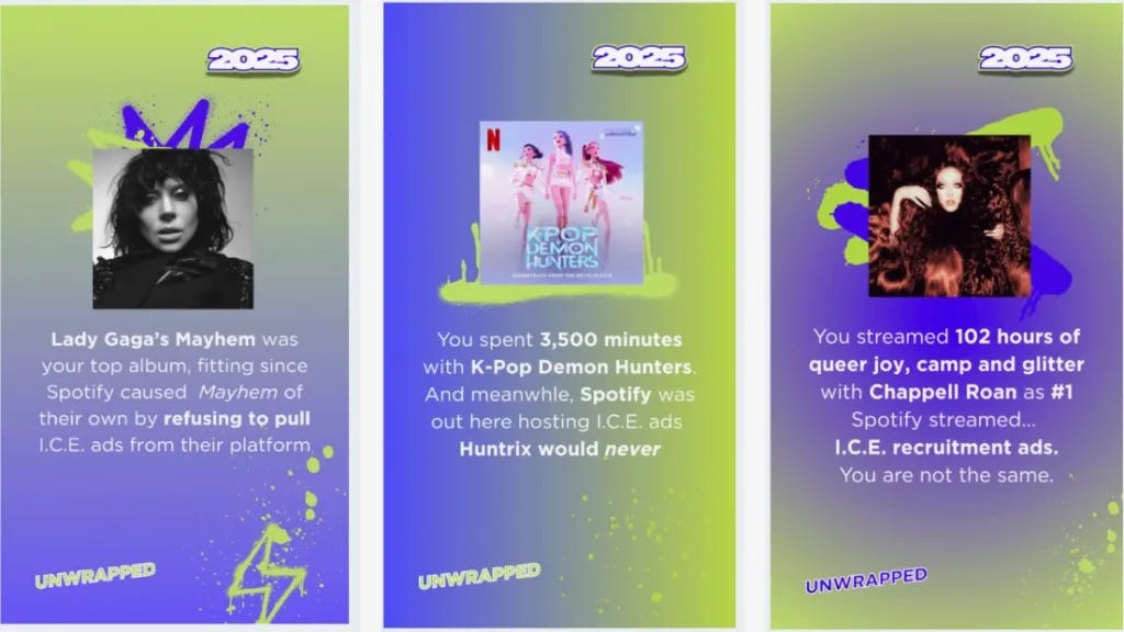 Como contramedida, Internet se ha organizado para hacer el Spotify Unwrapped. Gráficos que imitan la estética de estas estadísticas compartidas, pero recuerdan los anuncios de ICE que la plataforma sigue permitiendo y que son motivo suficiente para organizar boicot. Uno de muchos.