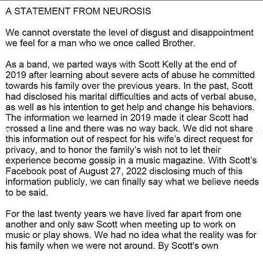Como banda, nos separamos de Scott Kelly a finales de 2019 tras conocer los graves actos de abuso que cometió hacia su familia durante los años anteriores. En el pasado, Scott había revelado sus dificultades matrimoniales y los actos de abuso verbal, así como su intención de obtener ayuda y cambiar sus comportamientos. La información que conocimos en 2019 dejó claro que Scott había cruzado una línea y que no había vuelta atrás. No compartimos esta información por respeto a la petición directa de privacidad de su esposa, y para honrar el deseo de la familia de no dejar que su experiencia se convierta en un chisme en una revista musical. Con la publicación de Scott en Facebook del 27 de agosto de 2022, que revela gran parte de esta información públicamente, por fin podemos decir lo que creemos que hay que decir.