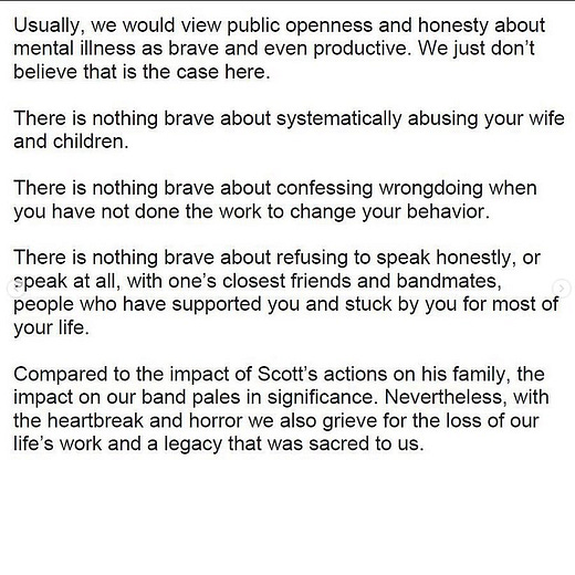 Durante los últimos veinte años hemos vivido lejos el uno del otro y sólo veíamos a Scott cuando nos reuníamos para trabajar en la música o tocar en espectáculos. No teníamos ni idea de cuál era la realidad de su familia cuando no estábamos cerca. Según admitió Scott, sus abusos eran intencionados, dirigidos y un secreto muy bien guardado, incluso para los que estábamos más cerca de él. Una vez que nos enteramos de sus abusos, fue difícil conciliar la horrible información con la persona que creíamos conocer. No es de extrañar que ocultara los abusos durante tanto tiempo, porque es una traición a nuestra ética como compañeros de banda, socios, padres y seres humanos.
