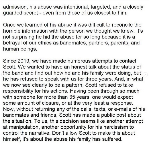 Queríamos tener una charla sincera sobre el estado de la banda y saber cómo estaban él y su familia, pero se ha negado a hablar con nosotros durante tres años. Y, en lo que ahora vemos claramente que es un patrón, Scott se negó a asumir la responsabilidad de sus acciones. Después de haber pasado por tanto con alguien durante más de 35 años, uno esperaría algún tipo de cierre, o al menos una respuesta. Ahora, sin devolver ninguna de las llamadas, mensajes de texto o correos electrónicos de sus compañeros de banda y amigos, Scott ha hecho una publicación sobre la situación. Para nosotros, esta decisión parece otro intento de manipulación, otra oportunidad para que su narcisismo controle la narrativa. No permitas que Scott haga esto sobre sí mismo, es sobre el abuso que ha sufrido su familia.