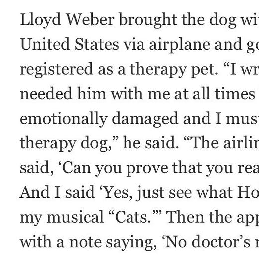 🙀 Algunos todavía no se han recuperado de la película de Cats. Entre ellos, el escritor del musical original, Andrew Lloyd Webber, que del disgusto se ha tenido que comprar un perro… Y lo usa como perro terapeútico.