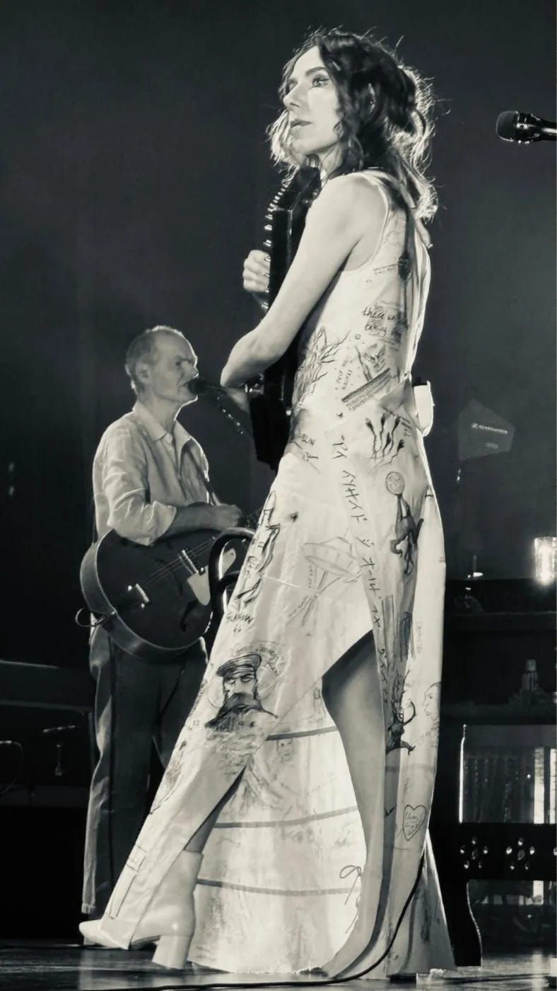 Una gira deja una serie de marcas, sean físicas y emocionales, que sirven también de recuerdos de todo tipo de los lugares que se han visitado. PJ Harvey ha decidido plasmarlos de manera más clara en cada rincón de tela que compone el vestido con el que ha ido tocando esta pasada gira.