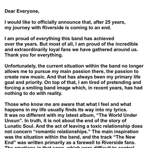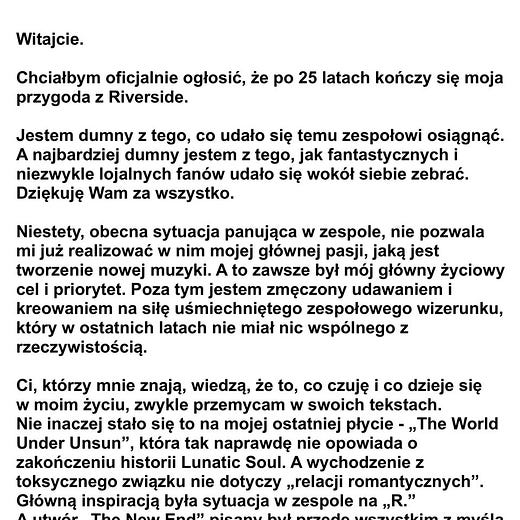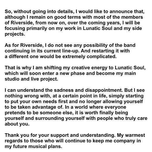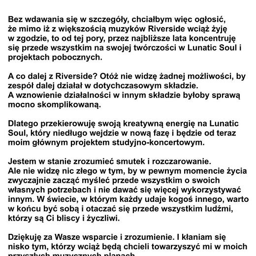 En un impresionante giro de los acontecimientos, Riverside se han acabado, al menos tal y como los conocemos. Mariusz Duda, bajista y cantante además de principal motor creativo del grupo, ha anunciado su marcha tras años de “relación tóxica” en los que se cansó de intentar “fingir y forzar una imagen de banda sonriente que, en los últimos años, no tiene nada que ver con la realidad”.