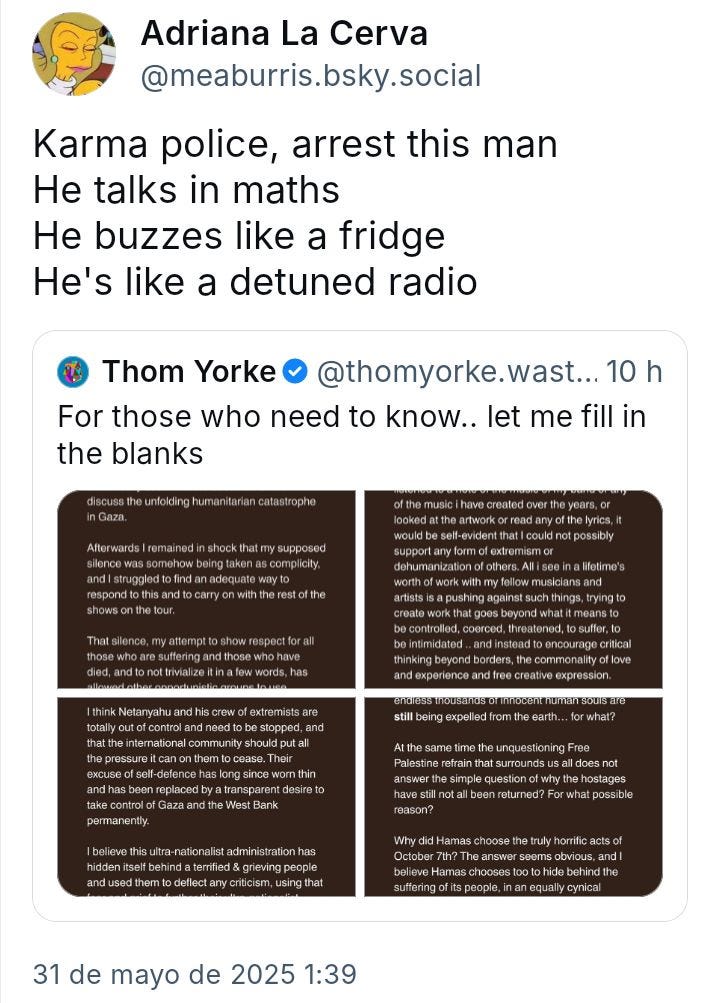 Realmente uno se pregunta que tienen que ganar estos artistas al intentar “hacer contenido” en redes con estos temas, cuando lo único que habla a volumen notable son las acciones concretas. Es lógico sospechar, y así lo hacemos nosotros, que es todo cierto afán de, ahora, querer protegerse en la atalaya, con comunicados como el de Thom Yorke más arriba.