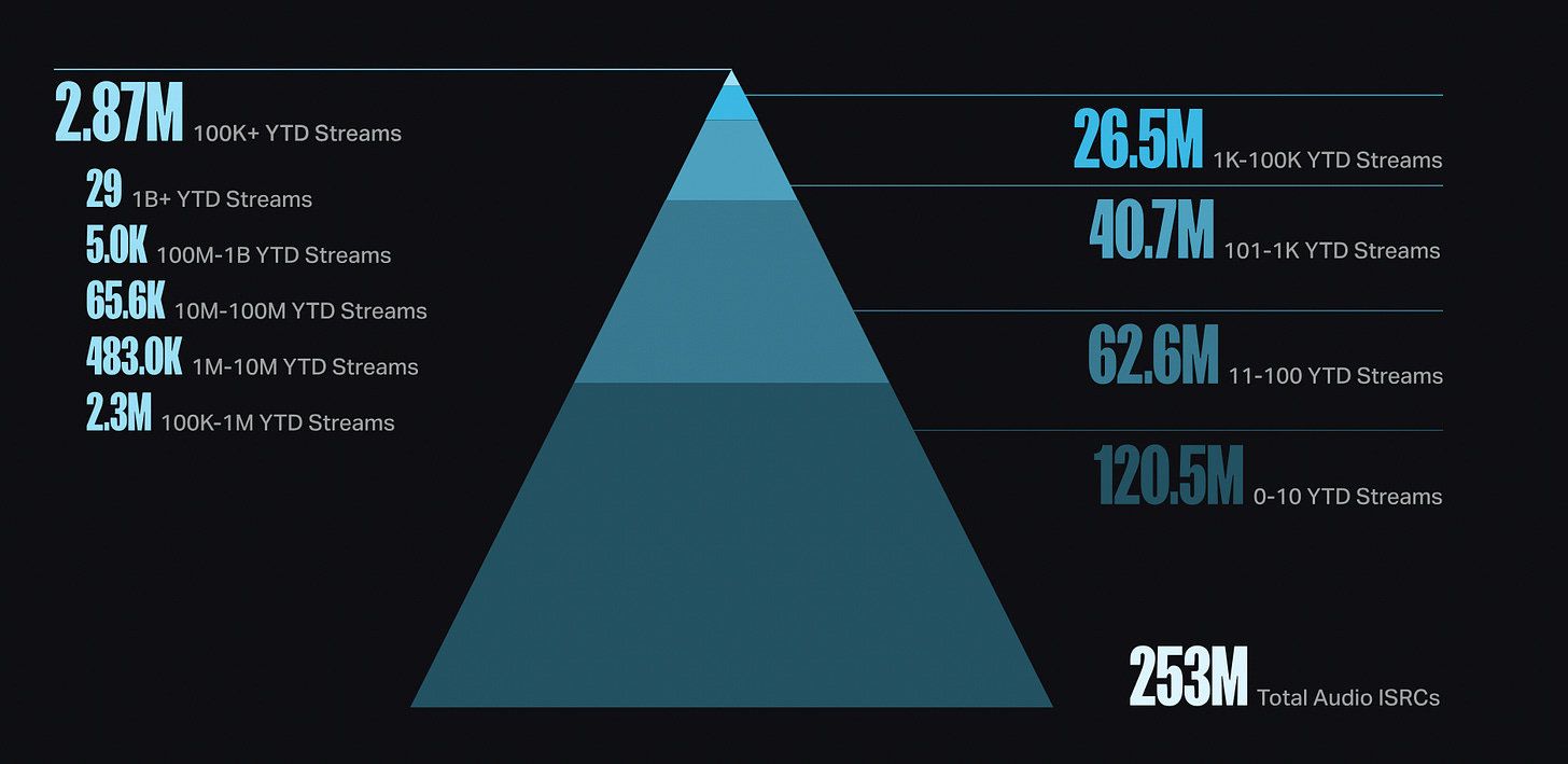 Ese pequeño triángulo blanco casi imperceptible y el siguiente nivel de azul más claro son los únicos que superan el límite establecido por Spotify para cobrar por su trabajo reproducido en la plataforma (1.000 reproducciones al año). Es decir, un 88% de lo que se escucha en streaming no recibe nada de esas suscripciones que ahora recaudan más para un servicio más empobrecido por meter IA a marchas forzadas. El trile más descarado que han querido colarnos en tiempo.