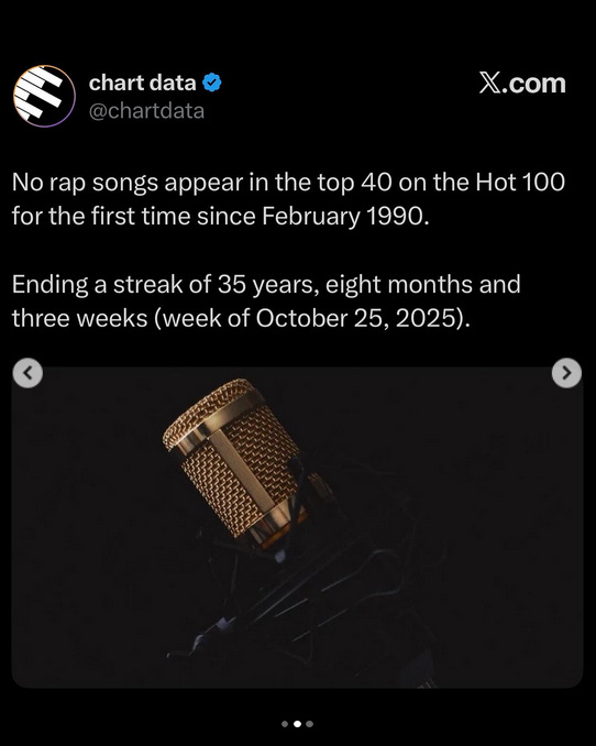 Un titular está caldeando conversación a varios niveles. Por primera vez desde febrero de 1990, no hay una canción de hip hop o con rap en ella en el top 40 de Billboard, el termómetro establecido para controlar lo que se vende y escucha. Es sorprendente, dando el creciente paso del género en el mainstream para ser el movimiento no-pop más popular sobrepasando a las guitarras rockeras.