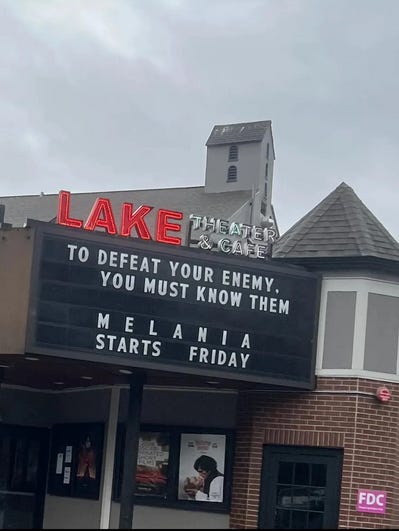 Aunque algunos le han querido dar una vuelta al hecho de proyectarla (porque ya solo la decisión es para discutir), como el caso del Lake Theater & Cafe de Lake Oswego, Oregon. Un pequeño cine con apenas un par de salas que, viendo que la oferta actual no le estaba funcionando, decidió poner el documental de Melania con un par de giros. Esos eran promocionarla en la marquesina con “Para conocer al enemigo debes conocerlo” o “Tampoco nos gusta ella” u ofertando subtítulos para gente con “dificultades para acentos”.