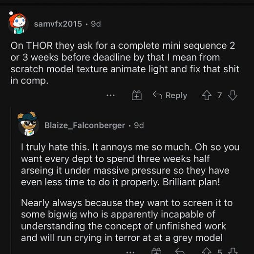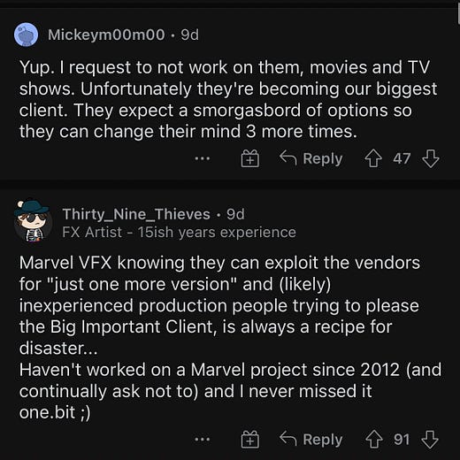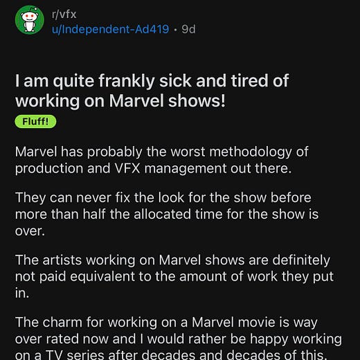 🤬 Que todas las películas de Marvel estén rodadas en un parking de Atlanta lleno de cromas verdes que luego reemplazan con CGI a saco no es porque salga más económico que construir decorados, vestimentas y otros elementos de atrezo, o porque tenga mejor acabado visual (LOL). Tiene más que ver con que, a diferencia de diseño de producción o vestuario, los trabajadores de efectos digitales no están sindicados y son más fácilmente explotables.