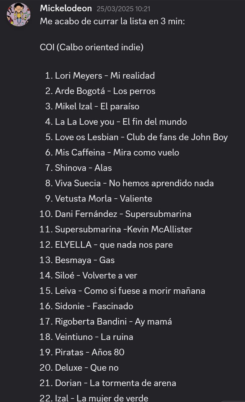Esto nos ha hecho recordar que en el discord hipersónico, nuestro querido Mickelodeon realizó el canon definitivo de los jits indietex. Esta playlist no os la vamos a subir a Spotify ni al resto porque aún no hemos pillado ninguna enfermedad este verano y queremos mantenerla así, pero si vosotros decidís hacerla, avisadnos y os ponemos un par de enlaces referidos a tiendas de camisas para divorciados.