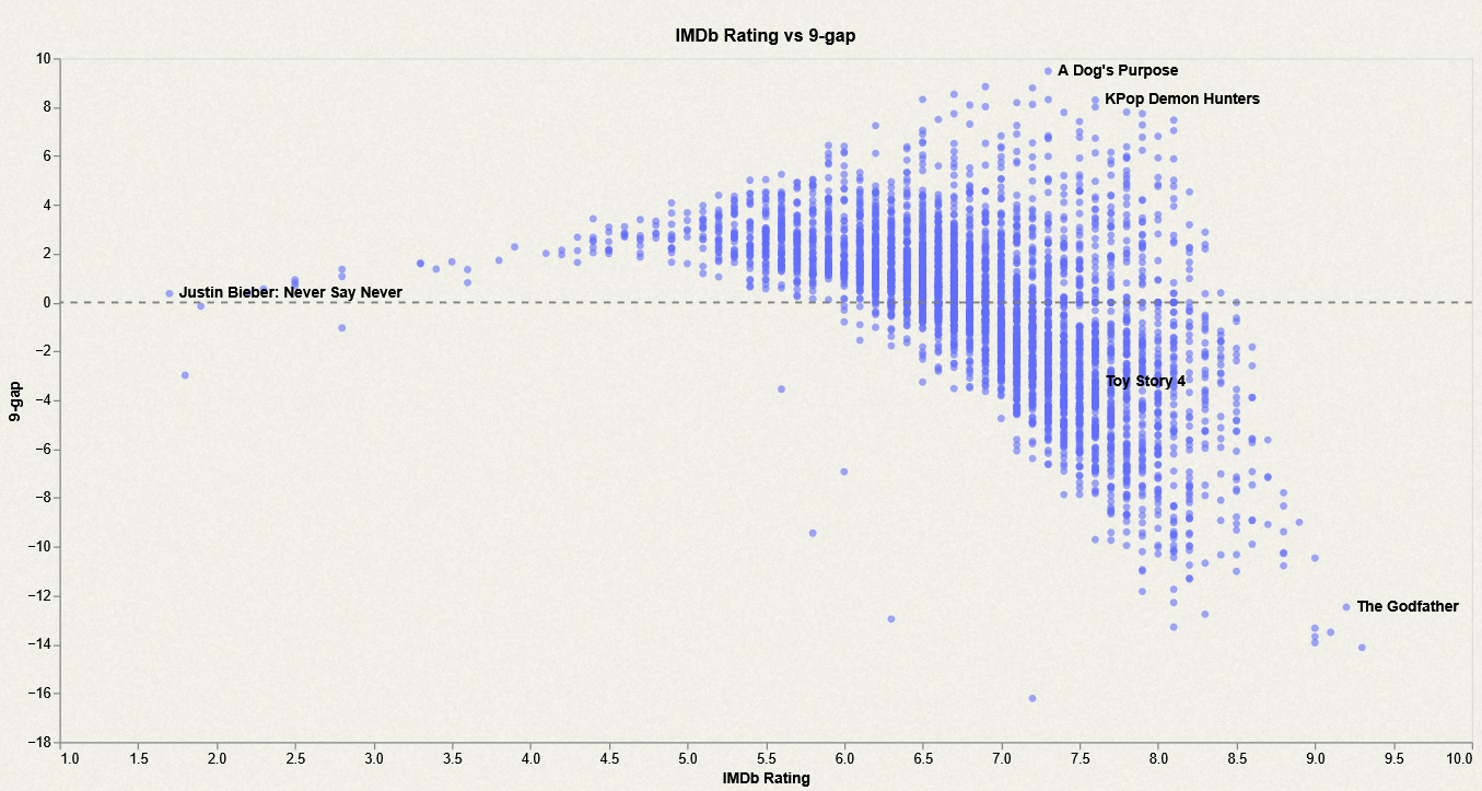 O, mejor dicho, la cantidad de gente que vota un 9 es desproporcionadamente inferior a la que pone un 8 o un 10 a determinadas películas, como Las guerreras K-Pop. David Gros en Dactile ha apreciado y estudiado lo que sería “el hueco del 9”, observándose una especie de U en la distribución de notas de muchas de las películas mejor valoradas.